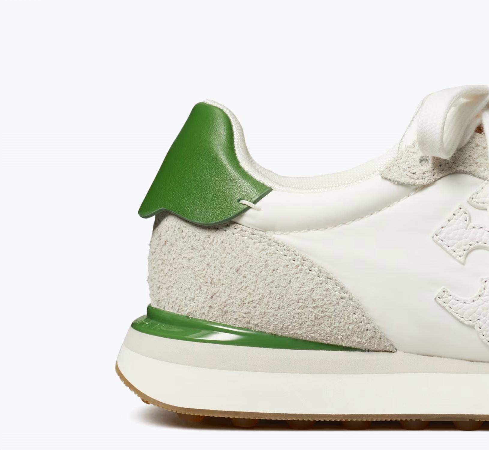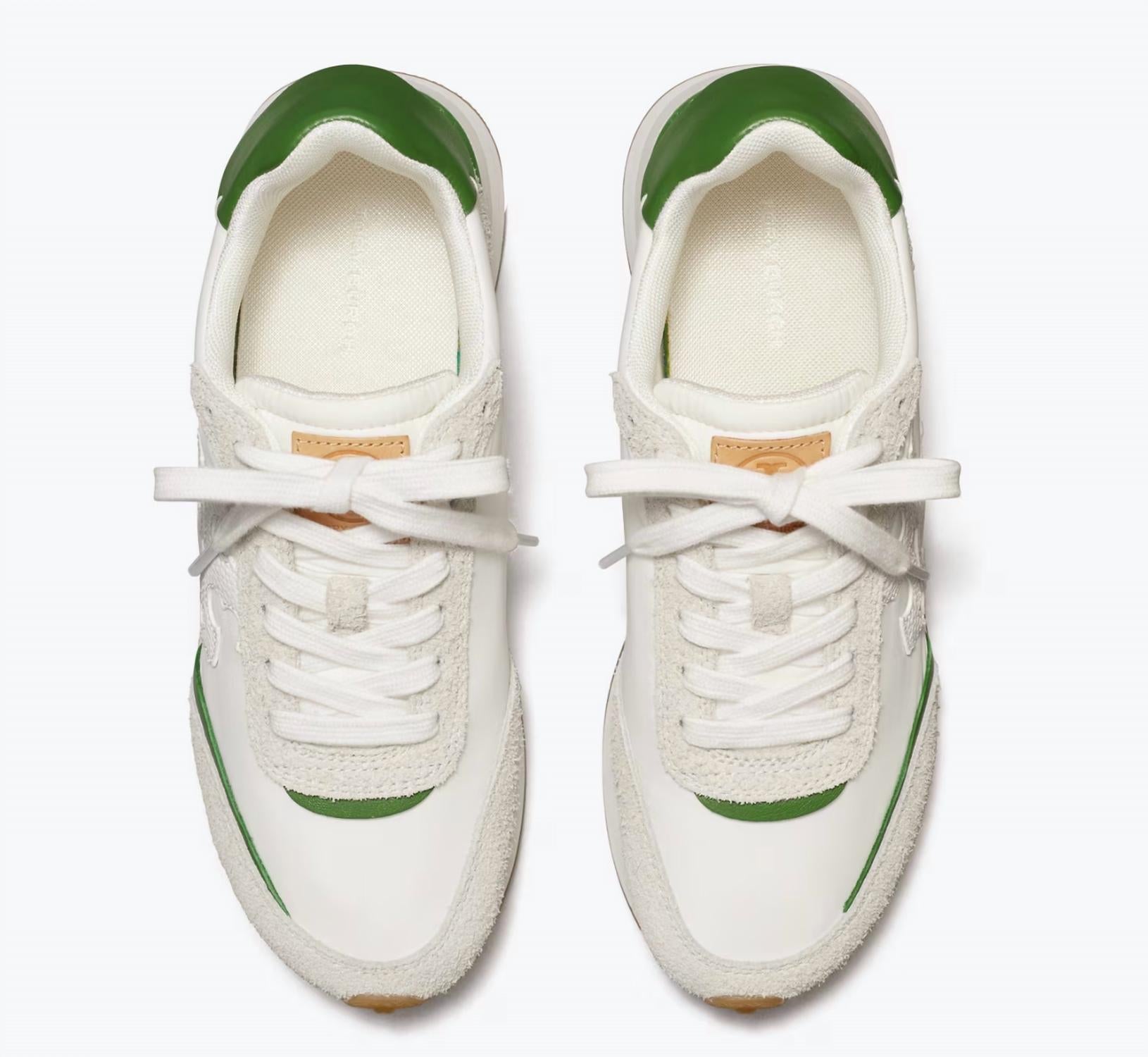Get your daily steps in with these adorable sneakers. Elevate your summer athleisure look with the Women's Destiny Trainer Sneaker Shoes by Tory Burch in chic White/Pale Green. These trainers boast an 86% polyester and 14% nylon woven fabric upper, complemented by suede and leather accents for a stylish finish. They feature a comfortable mesh lining and an EVA and rubber sole, ensuring durability and comfort with every step.