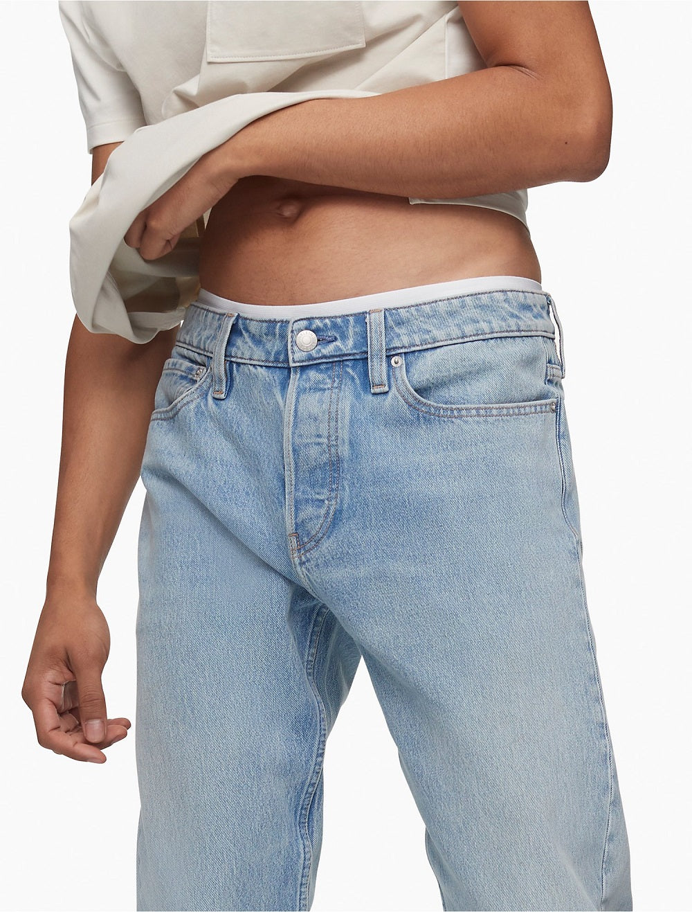 Styled with a streamlined silhouette in flexible stretch denim| these jeans from Calvin Klein lend a fresh feel to your casual look.| Approx. rise; 11-1/2; leg opening; approx. 15 | Slim straight fit; sits at waist| slim straight leg | Button Down Fly