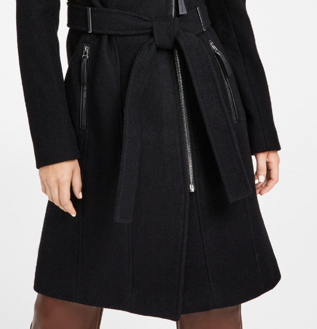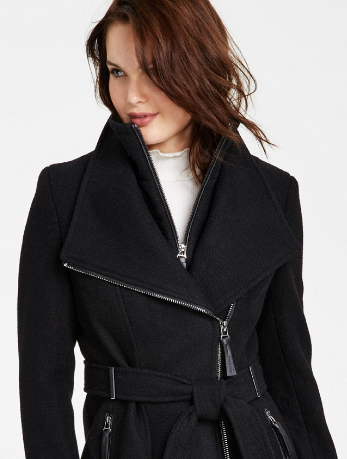 Wing collar; front asymmetrical zipper closure|Lined|Imported|Removable belt;