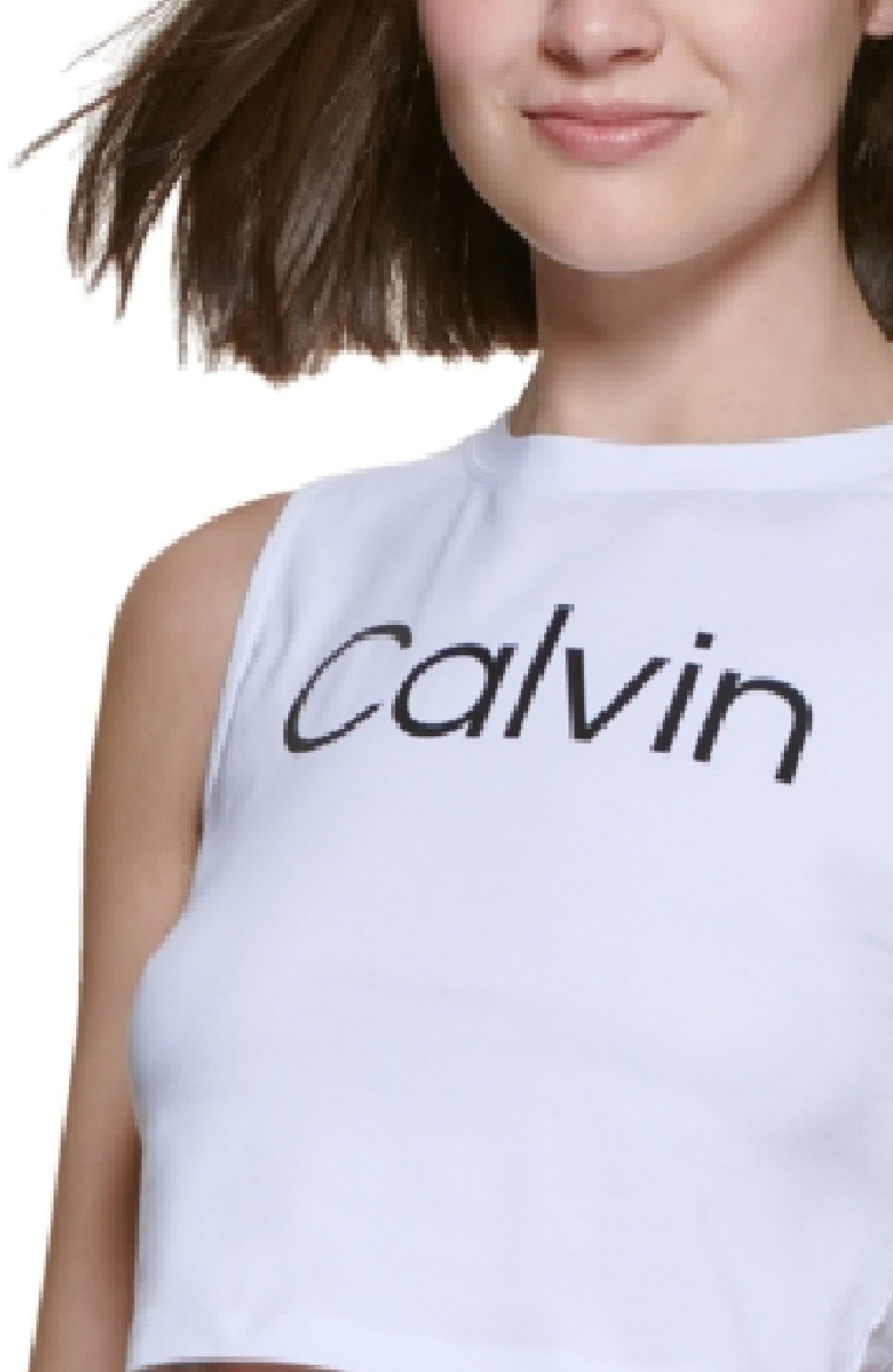 Comfy with shorts| skorts or leggings| this cropped tank top from Calvin Klein gives you signature flair and endless styling options.| Approx. 16 long; fitted| Crewneck; logo at front| Cotton/spandex| Machine washable