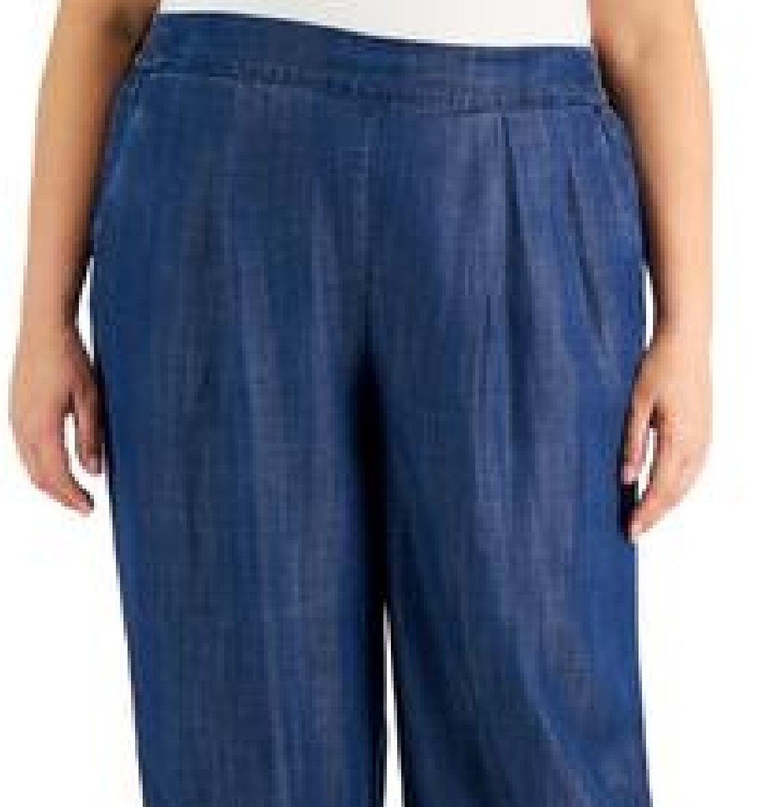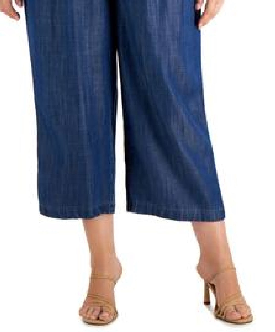 Style meets comfort in these Calvin Klein plus size denim pants| featuring a pull-on elastic waistband at the back and a breezy wide-leg cropped silhouette.| Approx. inseam; 24| Approx. front rise; 13-1/2; approx. back rise; 21-1/4| Pull-on style with elastic back| Slit pockets at sides