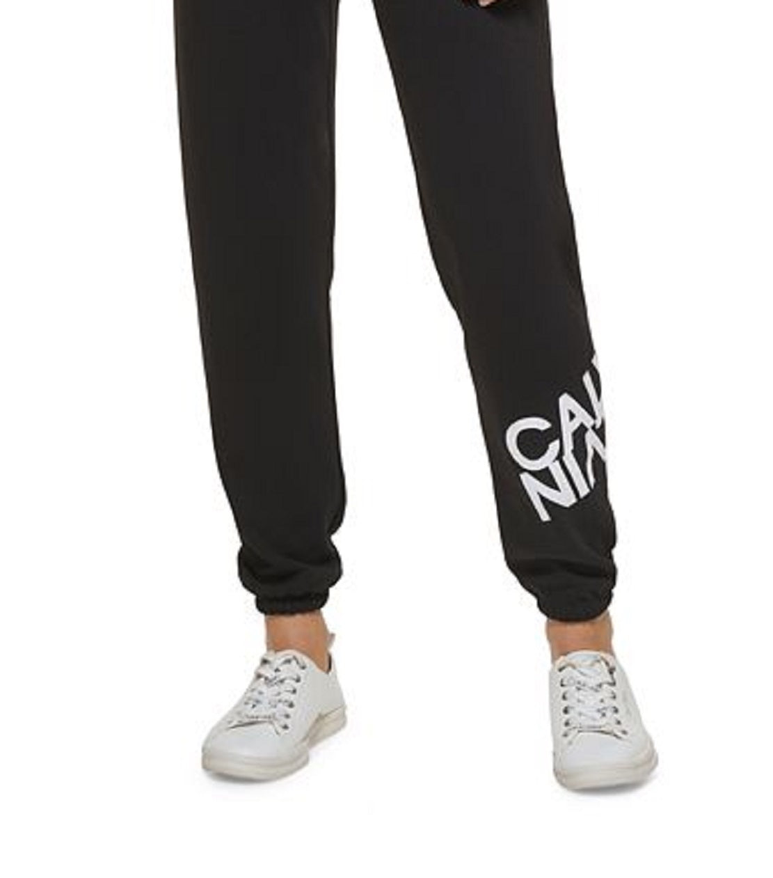 A bold logo print brings a dose of flair to these cozy pull-on jogger sweatpants from Calvin Klein | Mid rise; 9; approx. inseam; 29-1/2| Pull-on styling with self-tie drawstring at waist; logo tab at waist; logo print at leg| Cotton/polyester (40% recycled)| Machine washable| Imported