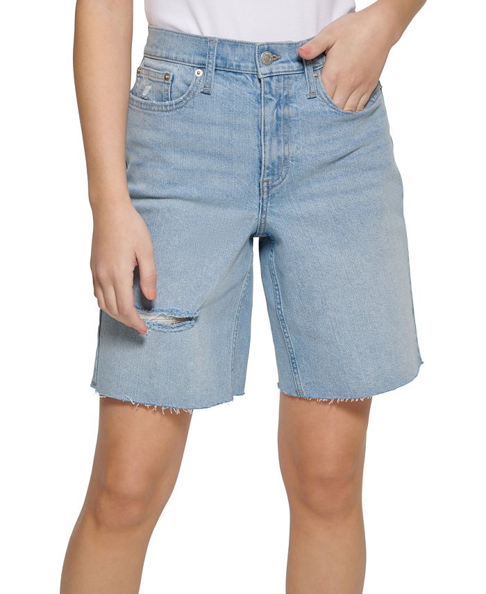 Bring back the 90s in a big way with these super-comfy jean shorts from Calvin Klein Jeans| complete with a frayed hem. | Approx. inseam; 7| Rise; approx. 11| Designed to fit and flatter 5'4 and under frame| Zipper and button closure; belt loops| Cotton/spandex