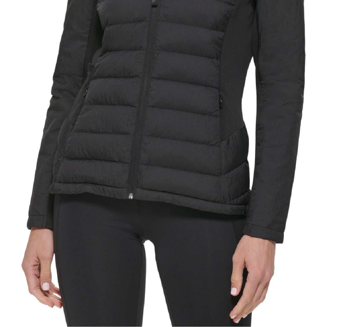 This stylish mix media coat from Calvin Klein features side pockets| a clever zip-off hood and a convenient water-resistant finish.| Stand collar with zip-off hood; front zipper closure| Imported| Two zipper pockets at waist| Water-resistant| Lined