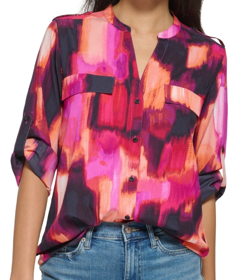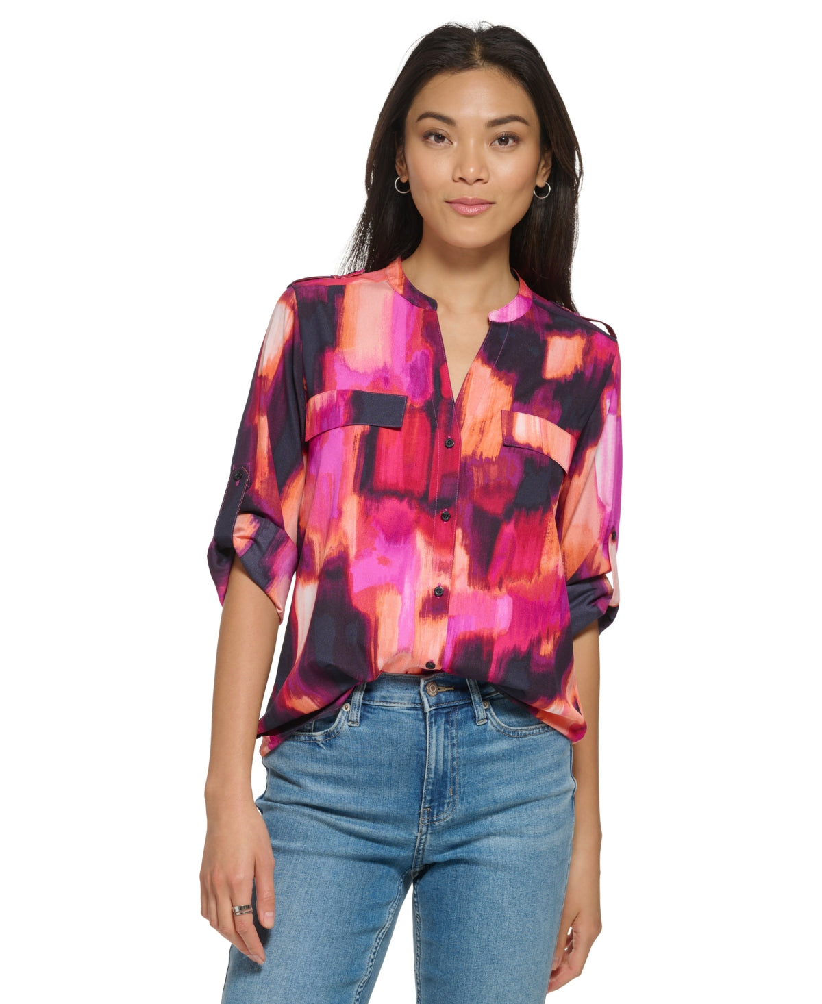 Refresh your wardrobe with this split neck button down blouse from Calvin Klein that you can dress up with slacks or keep casual with jeans.| Split neckline; button front closure| Imported| Roll tab long sleeves| Flap pocket at chest| | Size & Fit