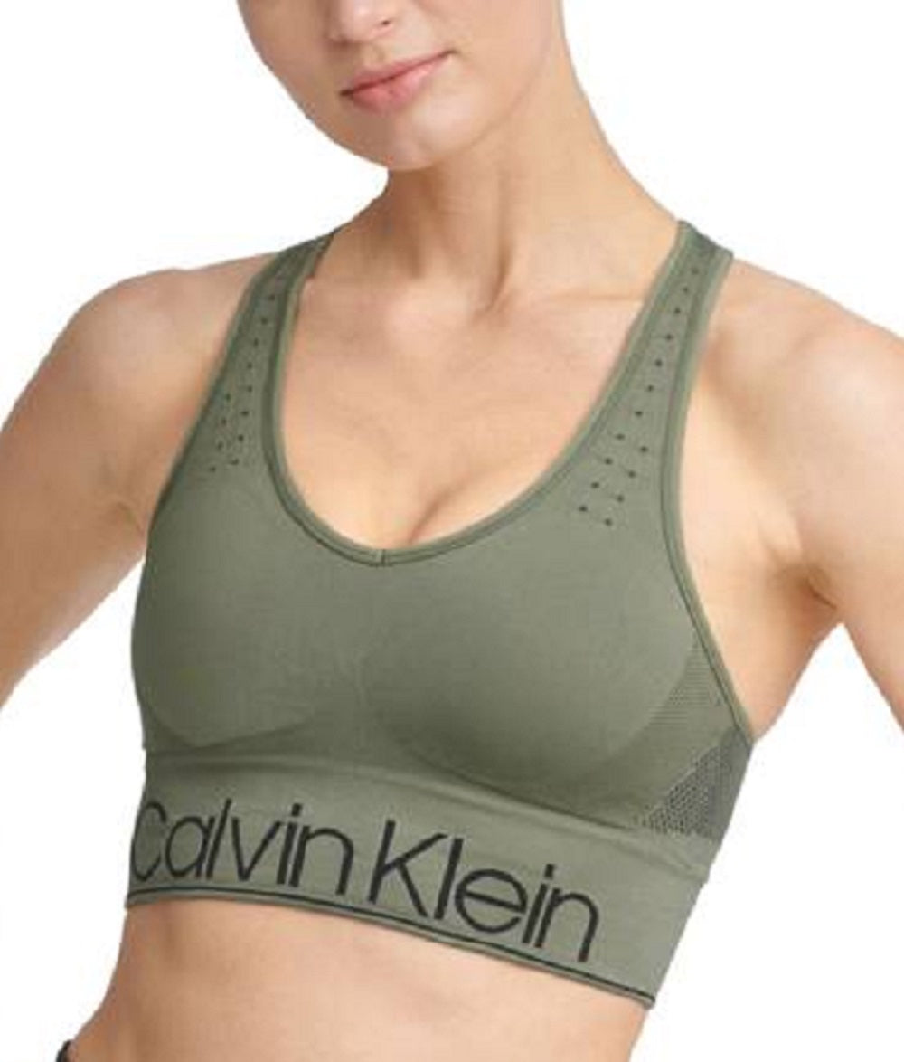 Your next training session gets a cute update with this mid-impact sports bra from Calvin Klein| designed with a V-neck and logo print at the hem.| Imported| V-neck; pullover styling; logo print at hem| Mid-impact sports bra ideal for weight training and light aerobics| Fitted|