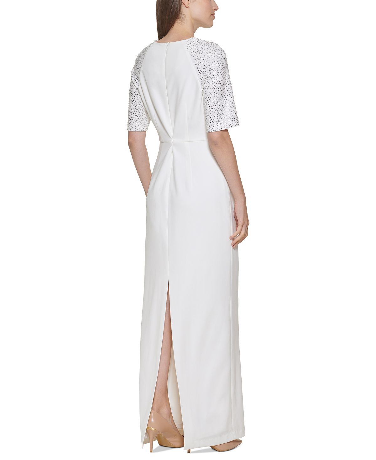 A knot at the waist of this Calvin Klein gown helps bring definition to its silhouette. Rhinestone-embellished sleeves add enviable glamour.| Approx. 59 long from center back neck to hem. Length is based on size 6 and varies 1/4 between sizes | Floor-length formal dress| Scuba crepe; Stretchy and supportive| Crewneck; gown silhouette| Concealed back zipper closure| Elbow-length sleeves