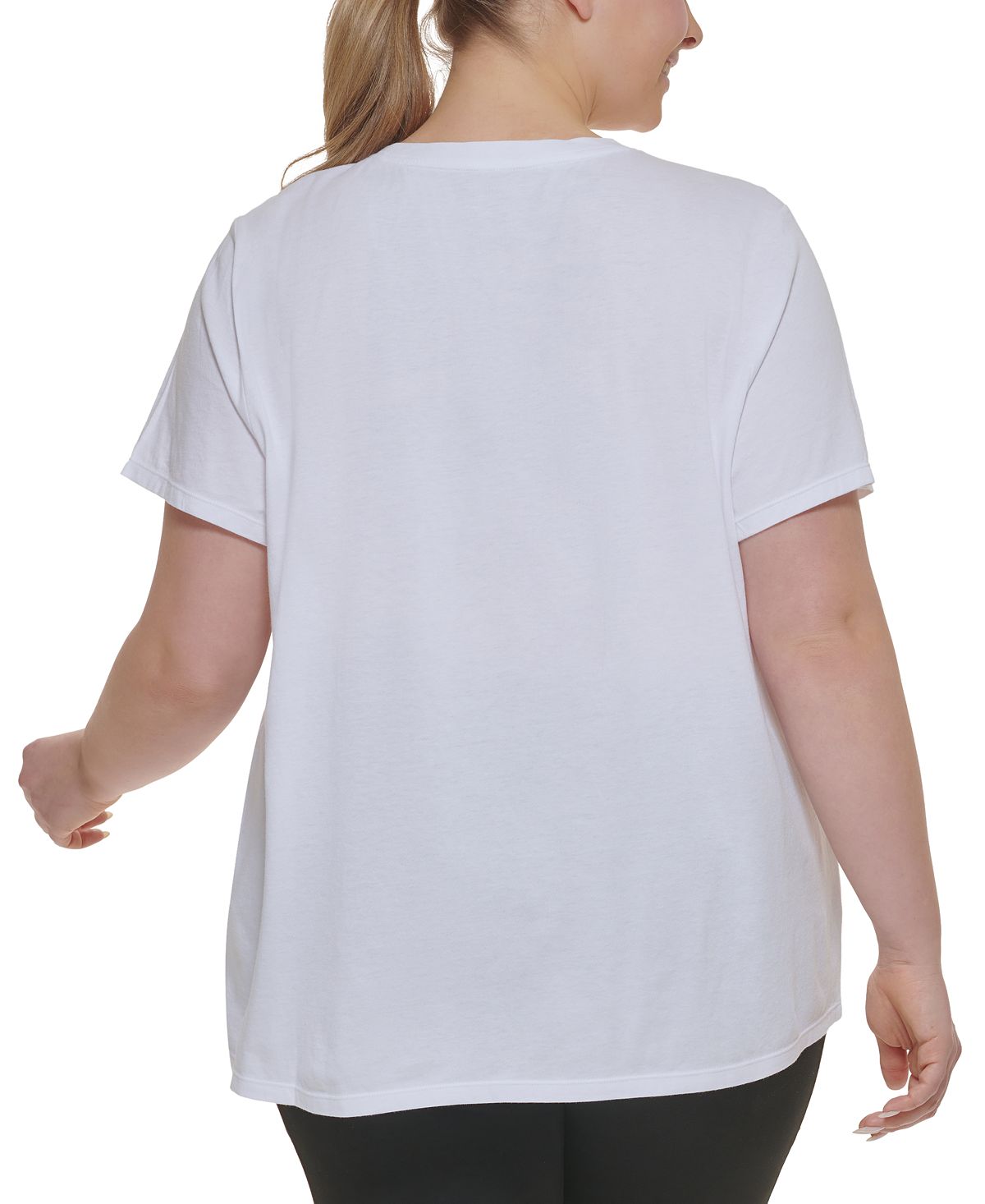 Whether you're exercising or running errands| keep it cute in this plus size logo T shirt from Calvin Klein.| Fitted; hits at hip; approx. 28 1/2 long| Crewneck| Logos at front| Cotton/modal| Machine washable