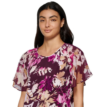 Calvin Klein Women's Printed Chiffon Flutter Sleeve Top Purple Size Large