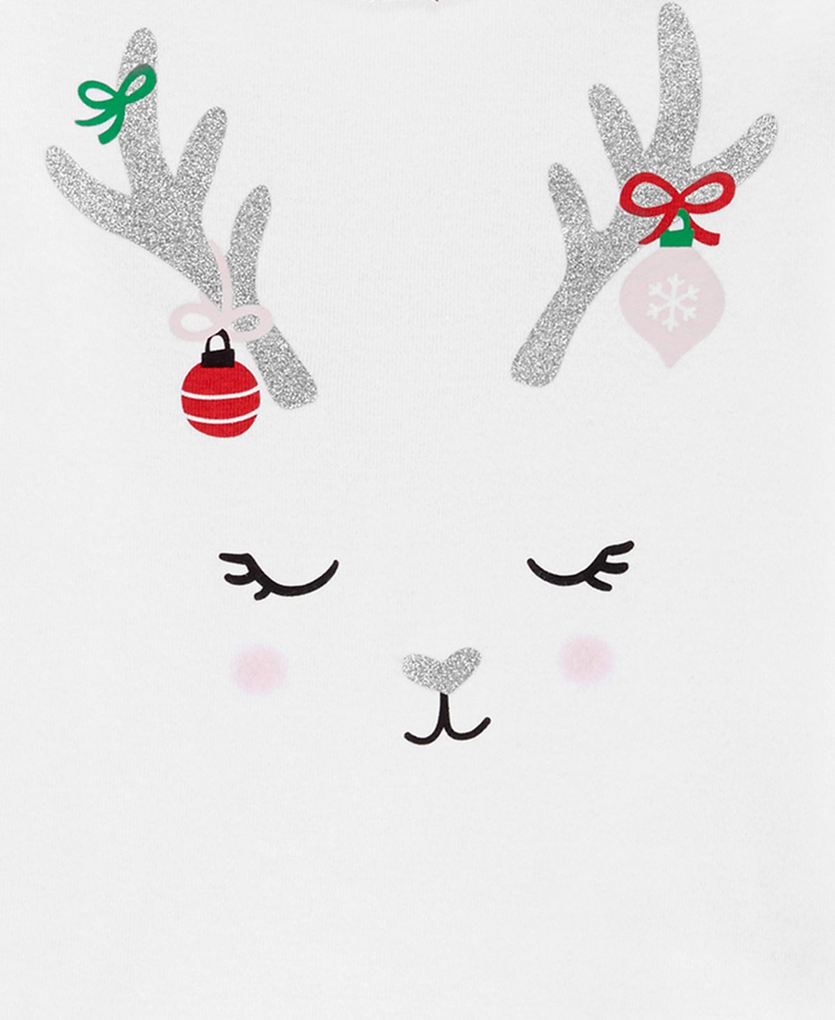 Styled in soft cotton| this reindeer pajamas set from Carter's includes an adorable tutu for extra festive style!| Top; ribbed at neckline and cuffs; screen-printed reindeer face and ornaments with glitter| Tutu; allover tulle with glitter| Pants; covered elastic waistband| Cotton pajamas are not flame resistant. To help keep children safe| cotton pajamas should always fit snugly