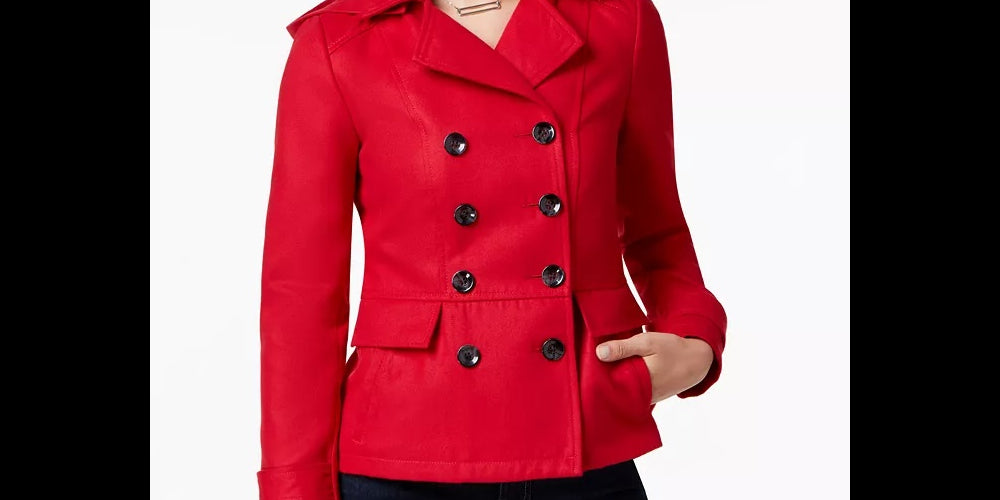 Short length; approx. length: 24-1/2" from center back to hem|Removable hood; notch collar; single-breasted button-closures|Strap and button details at back waist|Slit pockets at hips with faux flap details|Long sleeves with button details at cuffs|Lined|Shell: polyester/wool/; Lining: polyester