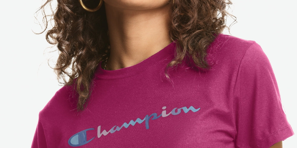 Make classic comfort and style part of your training routine with this Champion T-shirt| in soft fabric finished with a sporty logo.| Approx. 25 long| INSPIRED FOR; Athleisure| Soft ringspun fabric| Crewneck; logo at front; double stitching at sleeves and hem| Cotton/polyester