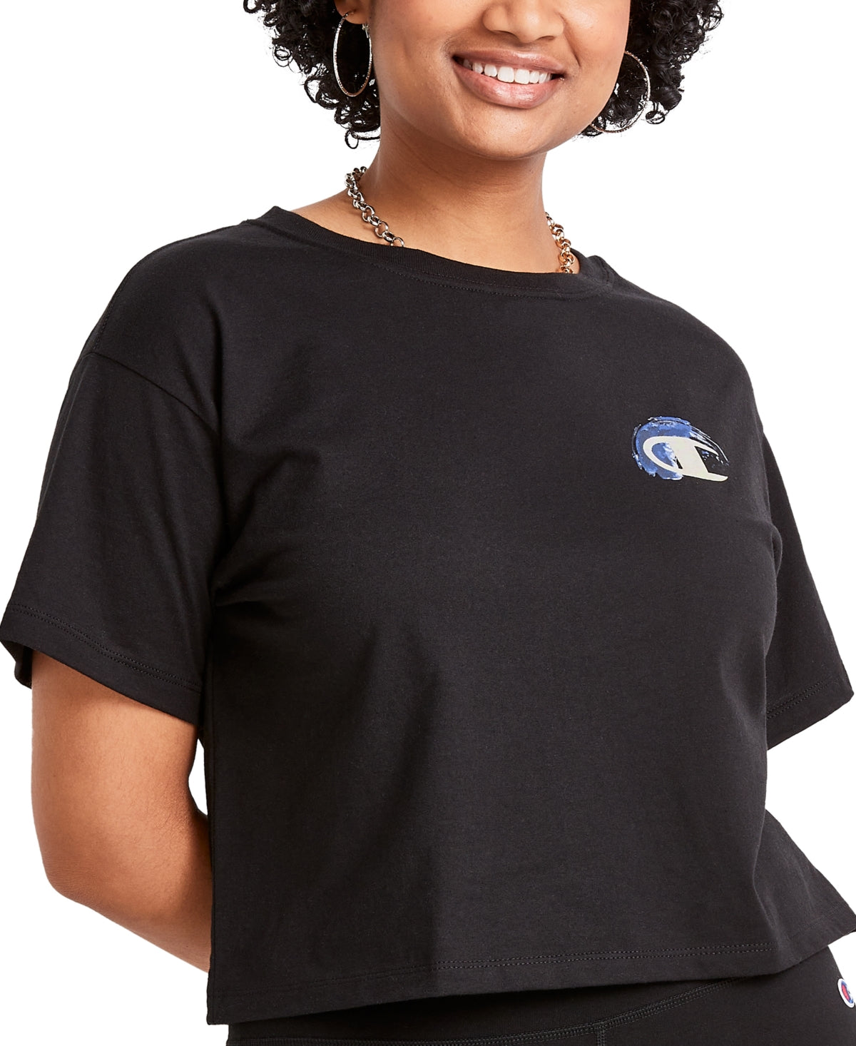 Running? Circuit training? Errands? Doesn't matter because Champion has you covered in roomy style with this cropped t-shirt.| Cropped | Crewneck; logo at left chest and neck back | Cotton/polyester| Machine washable| Imported