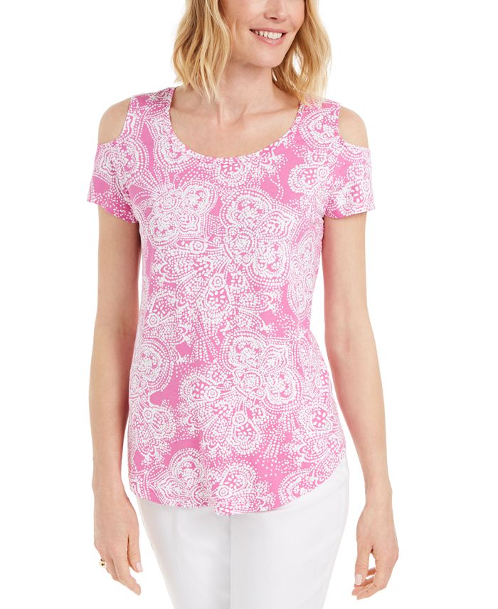 JM Collection Women's Printed Cold Shoulder Scoop Neck Top Pink Size X-Large