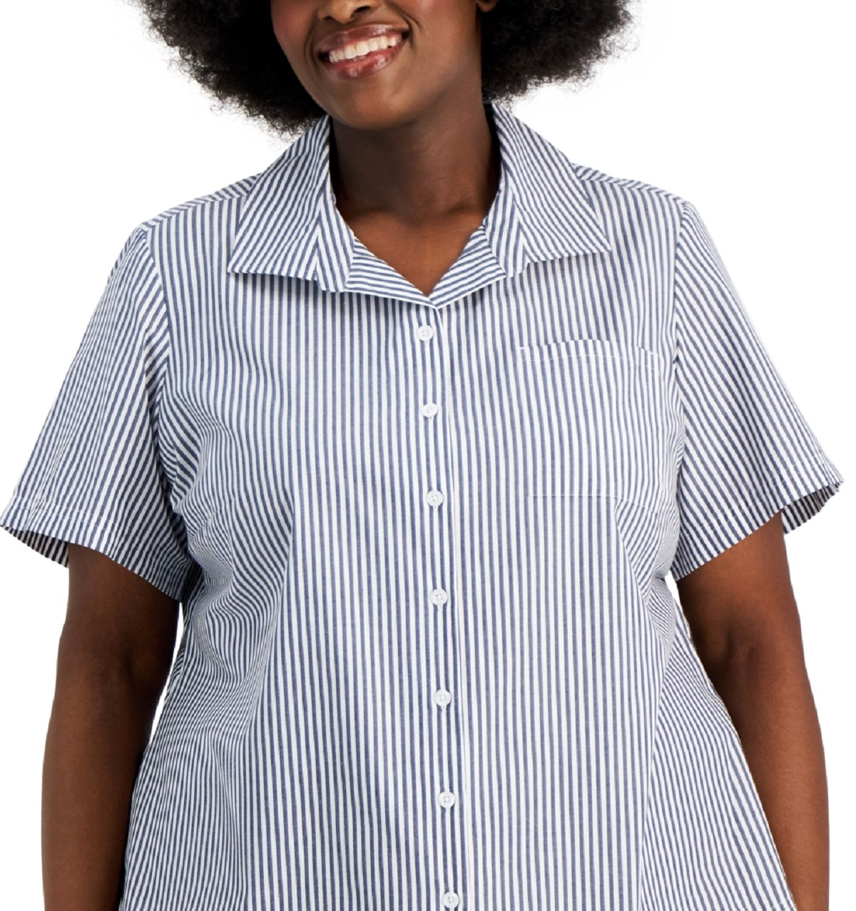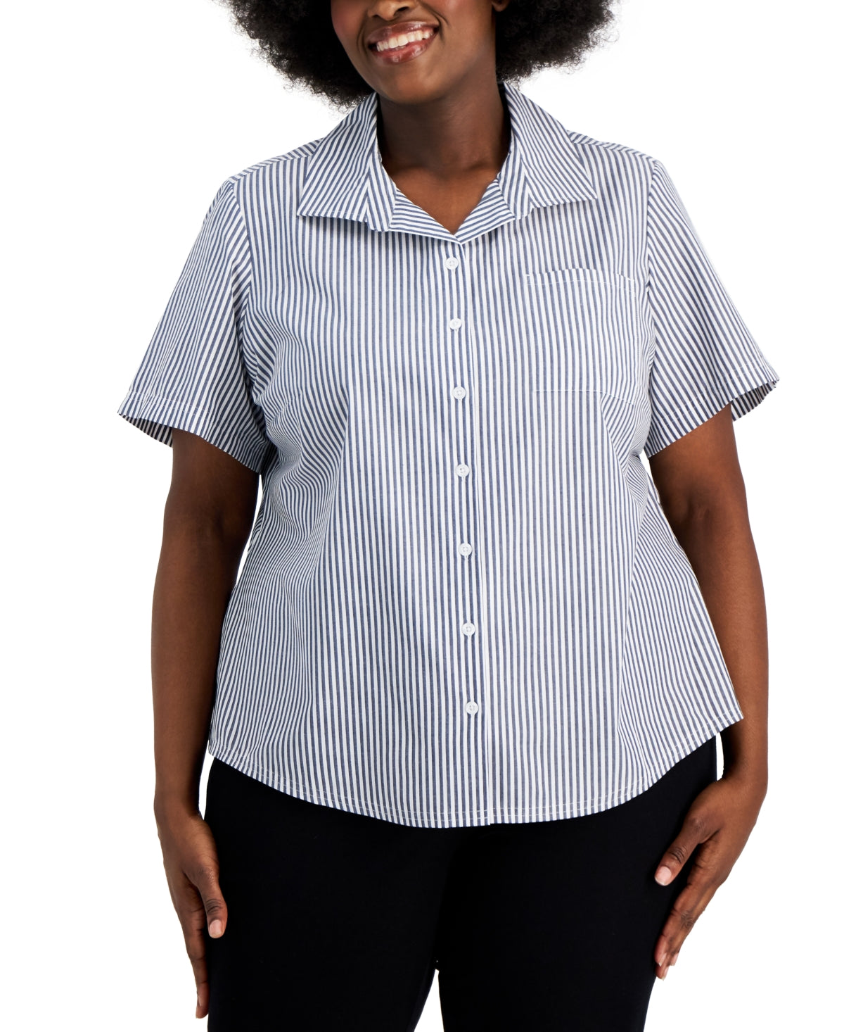 Earn your style stripes in this classic plus size shirt from Karen Scott designed with a single patch pocket at the front.| Approx. 27 long| Point collar; button front closures | Pocket at left chest | | Cotton/polyester