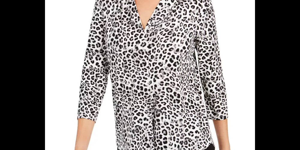 Relaxed fit; hits at hip; approx. 28" long|Due to generous sizing, we suggest sizing down for the perfect fit|V-neck|Ruched at shoulders|3/4-sleeves