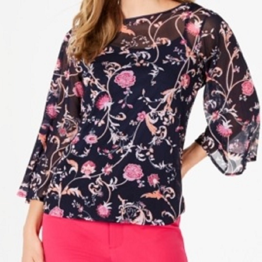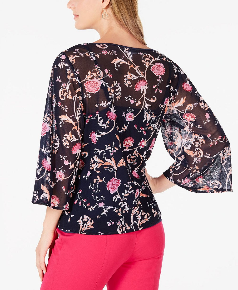 A sheer delight| this petite top from Charter Club features a mesh printed overlay and dramatic 3/4-length bell sleeves. A solid camisole is included for a one-step look.| Easy fit; hits at hip; approx. 18 long| Due to generous sizing| we suggest sizing down for the perfect fit| Designed to fit and flatter 5'4 and under frame| Boat neckline