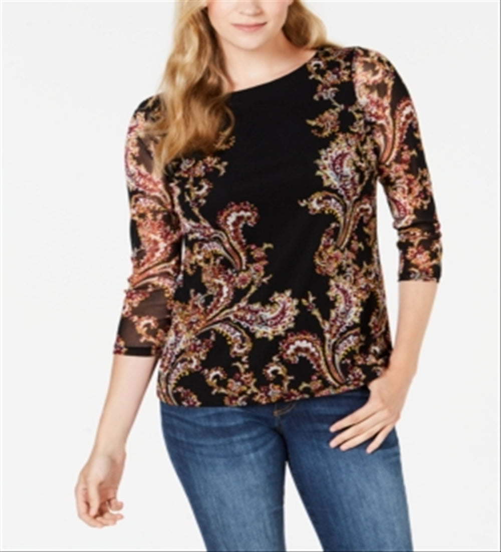 Lightweight and lovely| this layered mesh top from Charter Club accents your figure with a scrolling| elegant floral print. Semi-sheer 3/4-length sleeves complete the look.| Easy fit; hits at hip; approx. 26 long| Due to generous sizing| we suggest sizing down for the perfect fit| Boat neckline