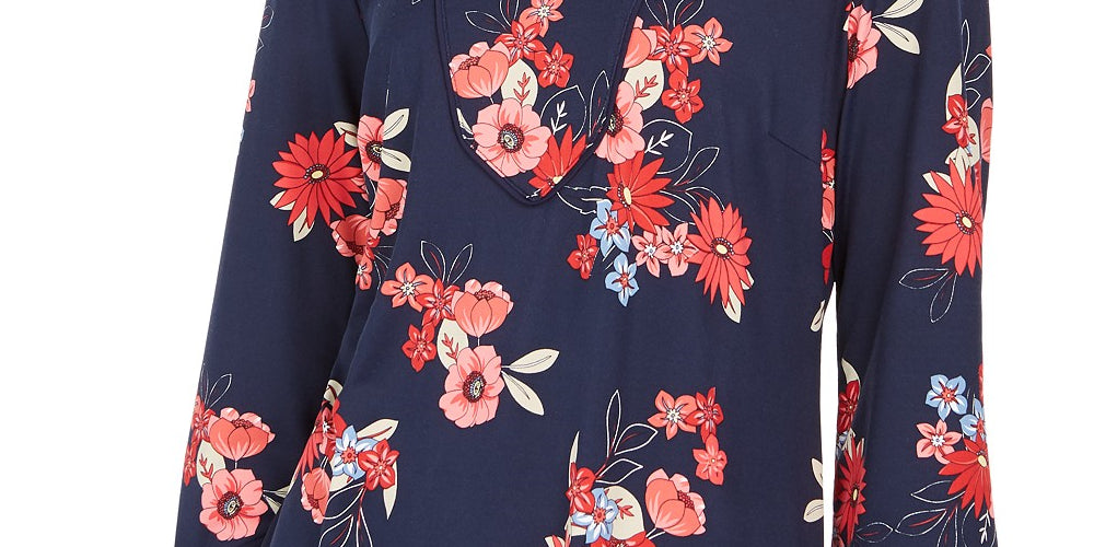Charter Club Women's Floral Print Split-Neckline Tunic Blue Size Small