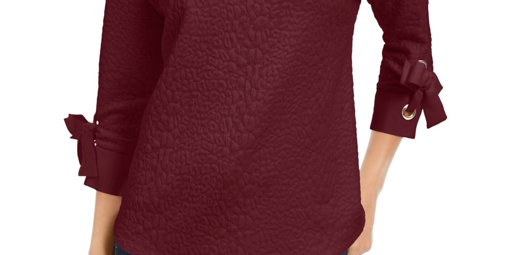 Approx. length; 22-1/2|Due to generous sizing; we suggest sizing down for the perfect fit|Designed to fit and flatter 5'4 and under frame|Boat neckline|Textured jacquard fabric|3/4-sleeves; grommets and bows at cuffs