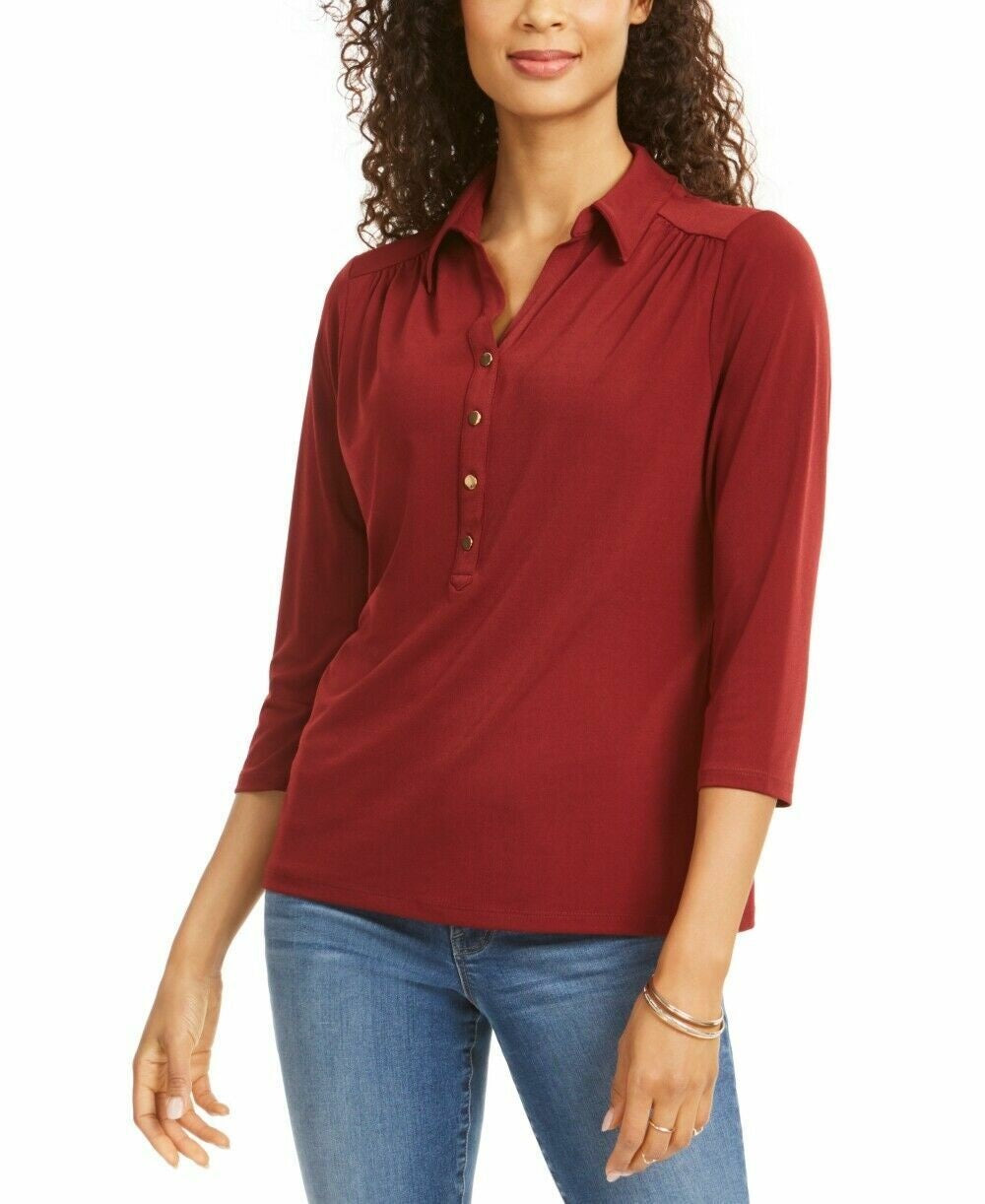 3/4-sleeves|Collar; partial button-front closures|Due to generous sizing, we suggest sizing down for the perfect fit