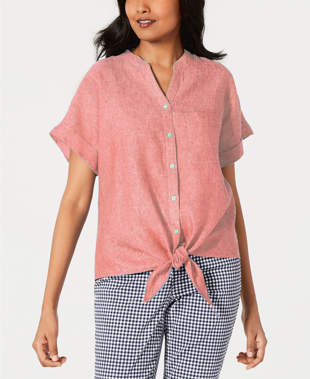 Charter Club Women's Linen Tie-Front Button-Up Shirt Orange Size Extra Large