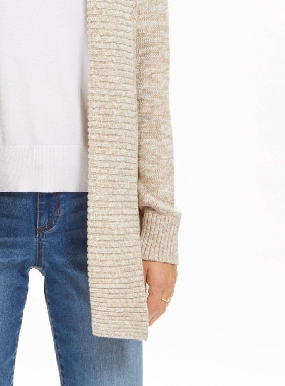 Relaxed fit; approx. 28" long|Due to generous sizing, we suggest sizing down for the perfect fit|Shawl collar; open front|Marled knit|Cotton/nylon/acrylic
