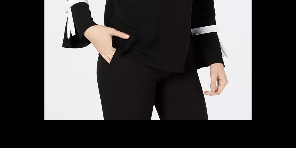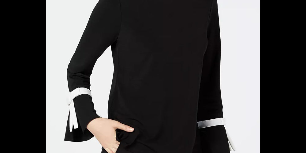 Relaxed fit; hits at hip|Designed to fit and flatter 5'4 and under frame|Crew neckline|Tie details at cuffs|Bell sleeves