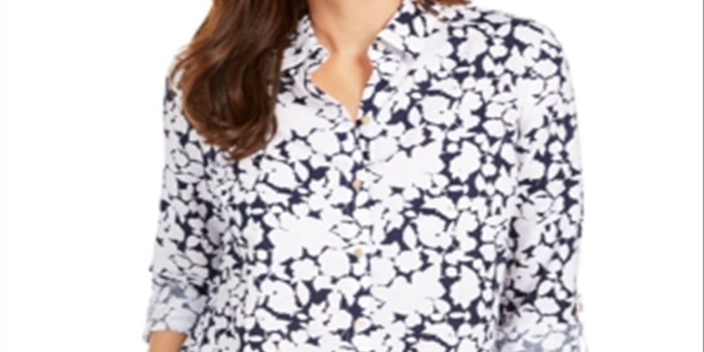 Charter Club Women's Printed Roll Sleeve Top Blue Size X-Large