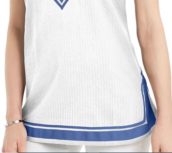 Due to generous sizing, we suggest sizing down for the perfect fit|V-neck|Textured fabric; contrast trim at neckline and hem; slits at side hem|All cotton|Machine washable|Imported
