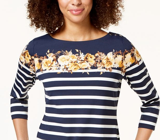 Charter Club caps nautical stripes with a floral-print garland in this fresh knit top| finished with buttons at the left shoulder.| Relaxed fit; hits at hip; approx. 26 long| Due to generous sizing| we suggest sizing down for the perfect fit| Boat neckline
