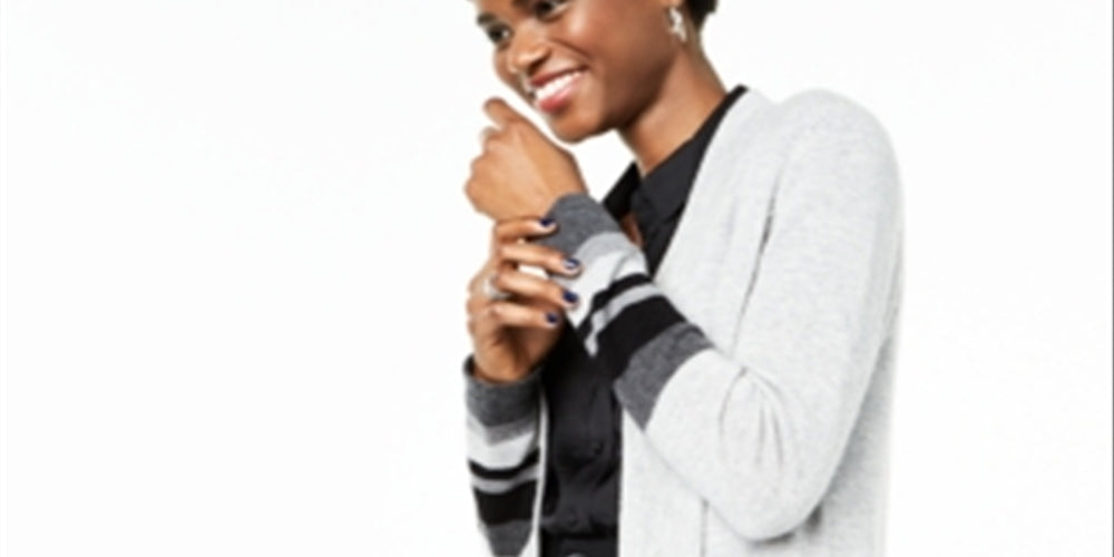Hits at thigh|open front with no closures| Striped at cuffs and hem