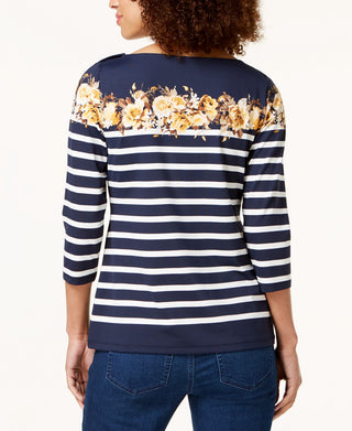 Charter Club Women's Striped 3/4 Sleeve Boat Neck Top Black Size Large