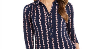 Charter Club Women's 3/4 Sleeve Printed Polo Top Blue Size Medium
