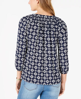 Charter Club Women's Petite Printed Split-Neck 3/4-Sleeve Top Blue Size Petite