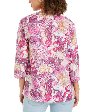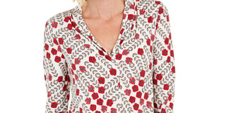 Charter Club Women's Printed Roll Sleeve Linen Blend Top Red Size XX-Large