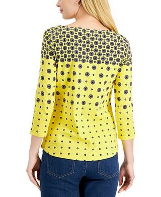 Charter Club Women's Printed Cotton 3/4-Sleeve Top Yellow Size Small