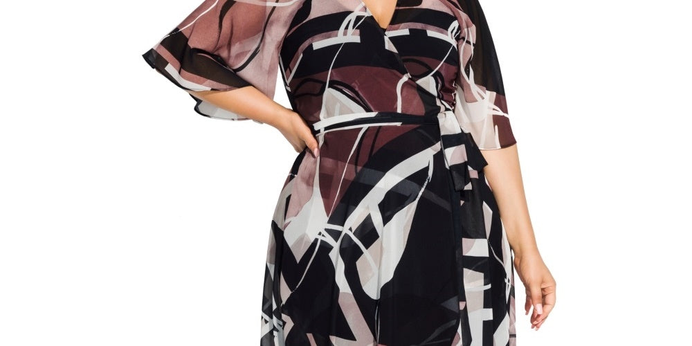 Approx. 54" long from center back neck to hem|V-neck; Fit & flare silhouette|Side tie closure|Batwing elbow sleeves|High-low hem