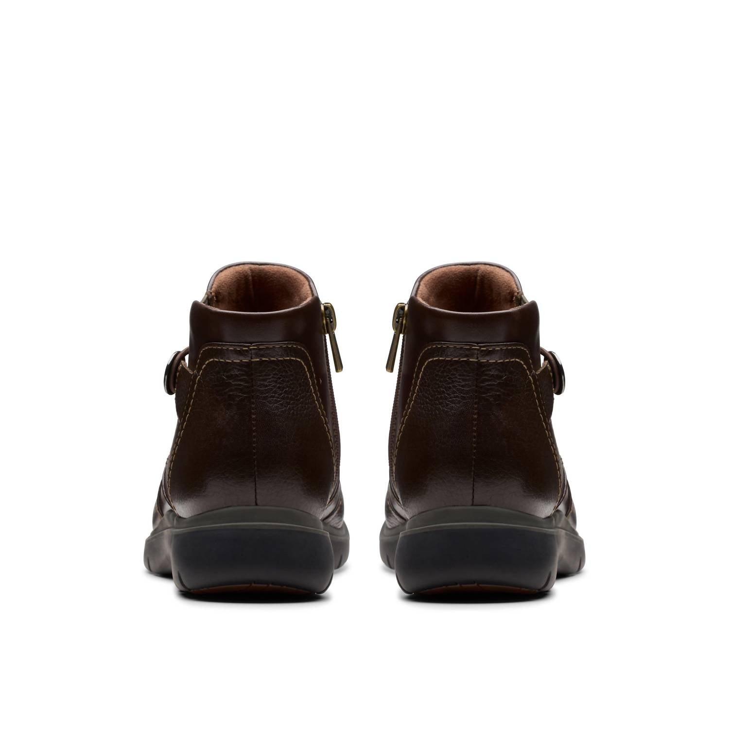 Say hello to the perfect, most versatile boot. The ankle height makes this style easily transition from day to night. Wear them with your favorite skinny jeans and tee for a more laid back look, or pair them with your favorite mini dress and jacket for a night out on the town. Step into effortless comfort with the Women's Certina Joy Ankle Boots by Clarks, crafted from premium dark brown leather. These boots feature a slip-on profile with a convenient button closure, providing style that is both elegant and functional. The lightweight and flexible TPR sole ensures exceptional traction, while the 3/4 inch heel height adds a subtle lift. Perfect for everything from running errands to relaxing at home.