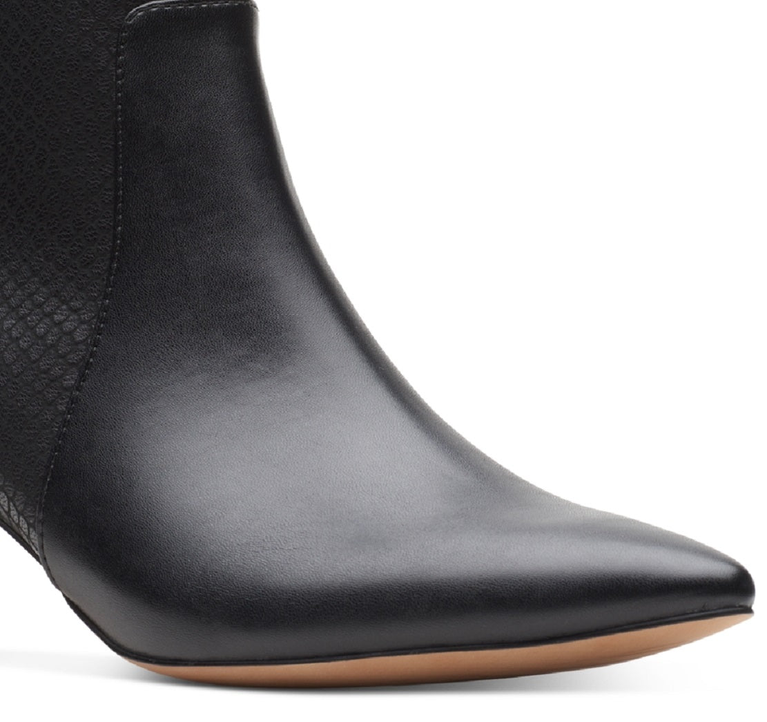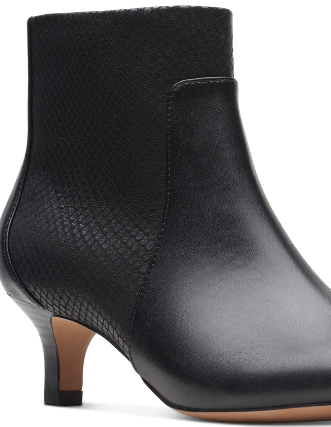 Clarks pairs overlay atop pointed toes and a kitten heel for a fun look in the Shondrah booties|