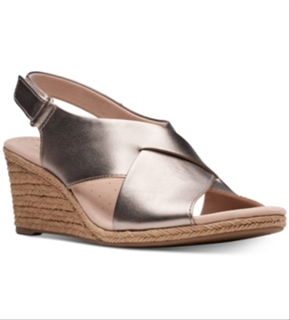 Smooth intersecting straps and textured espadrille soles combine in the soft-walking style of the Lafely Alaine wedge sandals from Clarks Collection.| 2-3/4 wedge heel| Round-toe sandals with stay-put closure | Wide cross straps; espadrille sole| Cushioned insole; OrthoLite footbed for comfort| | Leather upper; rubber sole