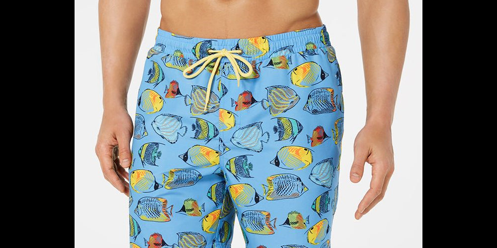 Dive into refreshing under-the-sea style and comfort with the colorful fish prints and mesh-lined interior of these quick-dry swim trunks from Club Room.| Approx. inseam; 7| Drawstring waistband| Interior mesh lining| Quick-dry fabric; fish-print pattern; two side-seam pockets; flap pocket at right back | | Polyester