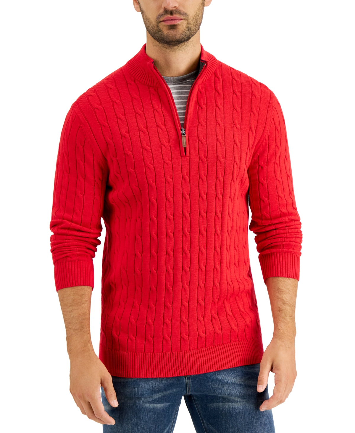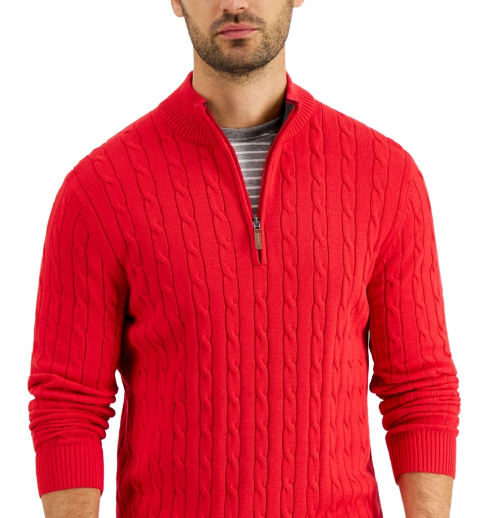 Imported|Cable knit pattern|Stand collar with quarter-zip closure