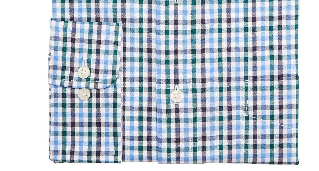 Spread comfort collar | Two-button cuffs | Gingham check pattern; patch pocket at left chest
