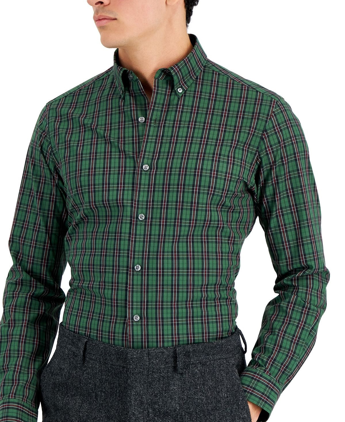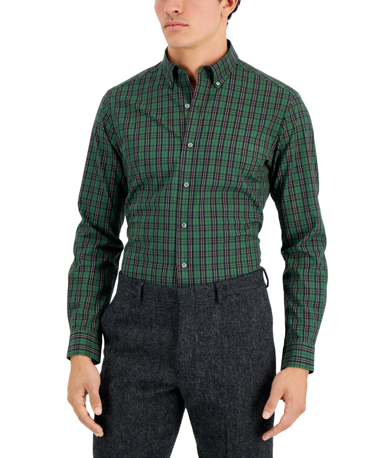 In a modern slim fit with four way stretch for added comfort| this Plata button-down shirt from Club Room features a sharp| allover plaid pattern