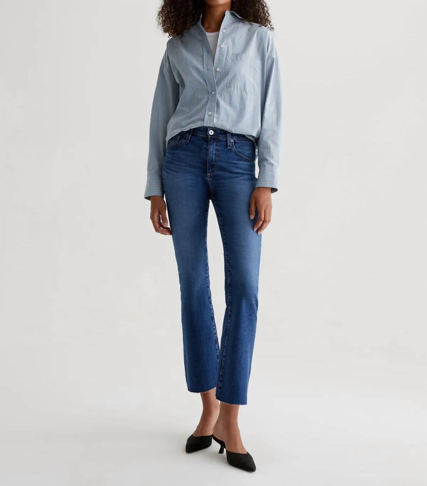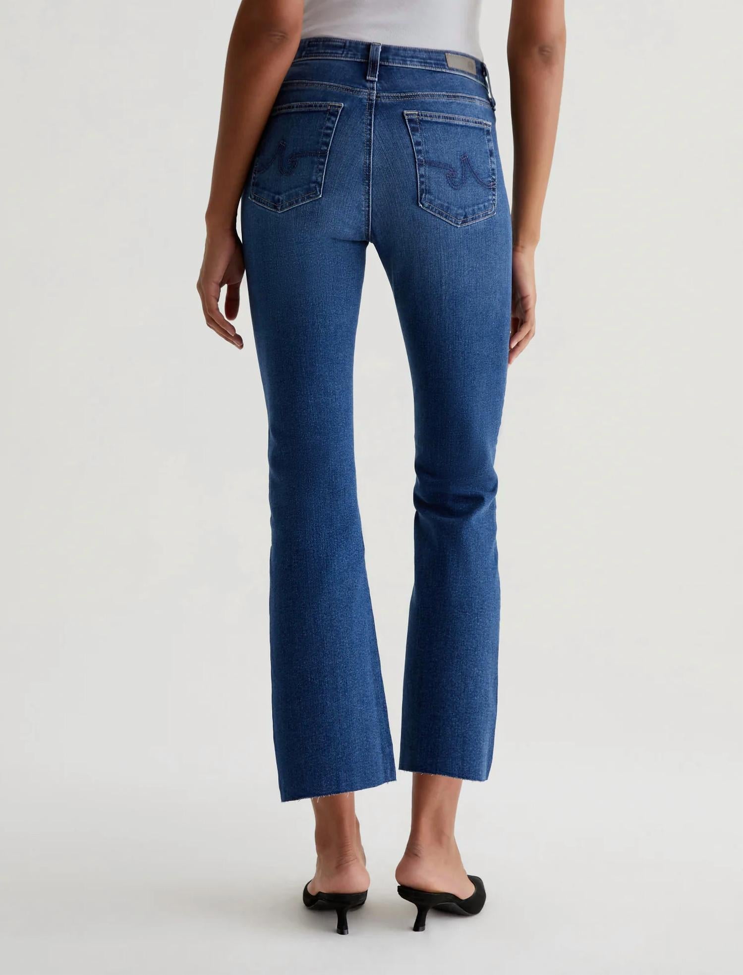 Embrace the Farrah Boot Crop by AG Jeans, a chic addition to your wardrobe in the Lucerne color. These cropped bootcut jeans feature a high-rise, skinny fit through the legs, and open into a subtle flare for a modern 90s vibe. Crafted from 10 oz. superstretch Empower Denim made in Japan, the composition includes 98% cotton and 2% polyurethane for added flexibility. Care: Machine wash. Measurements for size 25 include a 10" front rise, 14" knee opening, 18.5" bottom opening, and a 28" inseam.