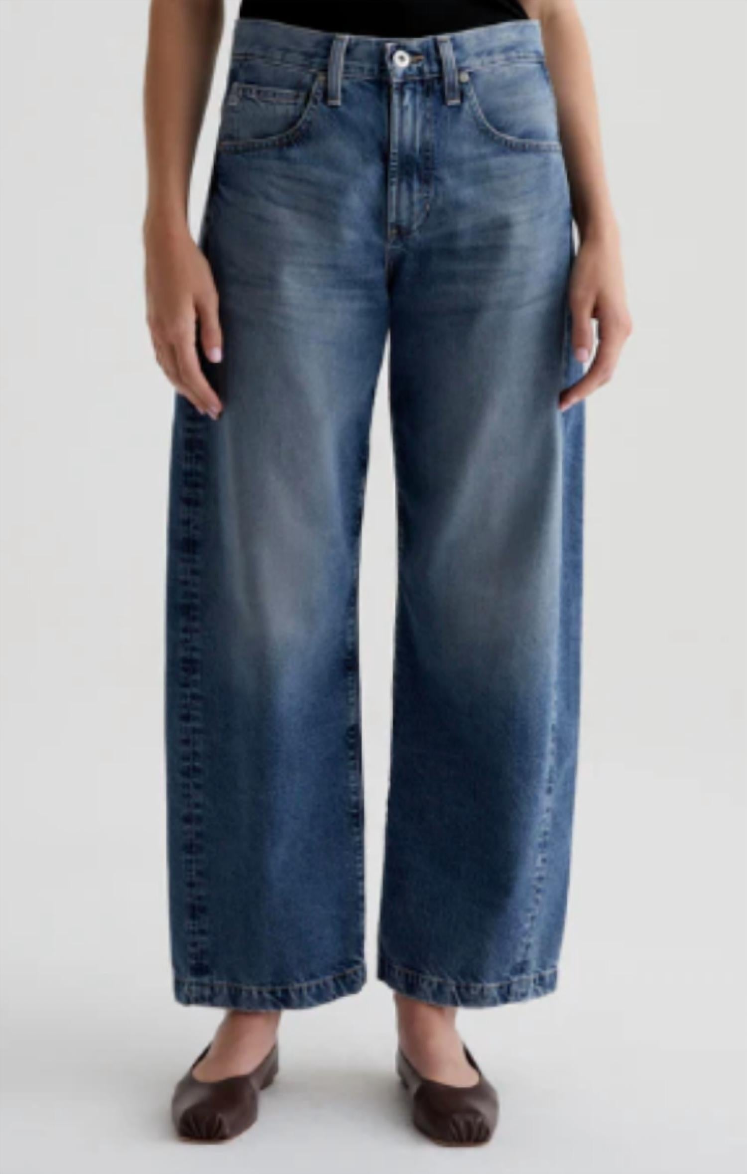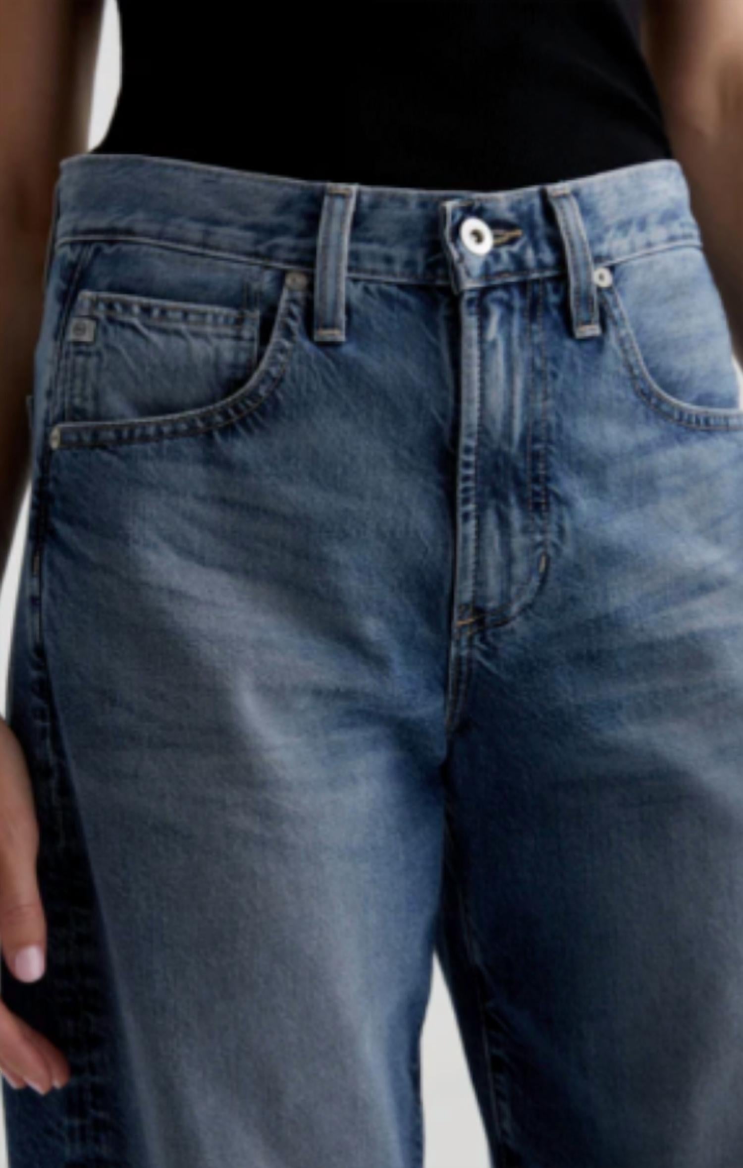 A flattering silhouette that's suprisingly versatile. Meet the Hattie High Rise Barrel by AG Jeans, a must-have addition to any wardrobe. Designed with a stylishly ultra high-rise waistline, these jeans feature a curved shape at the legs, forward side-seam paneling, and a classic button closure. Made from 100% high-quality Japanese cotton in a faded medium blue Bari wash, these jeans reach the ankle with a 28" inseam. Care for them with ease: machine wash and tumble dry. The front rise measures 11.5", with a knee opening of 22.25" and a bottom opening of 18.75". Perfect for those seeking a wide-leg silhouette with a touch of 90s flair.