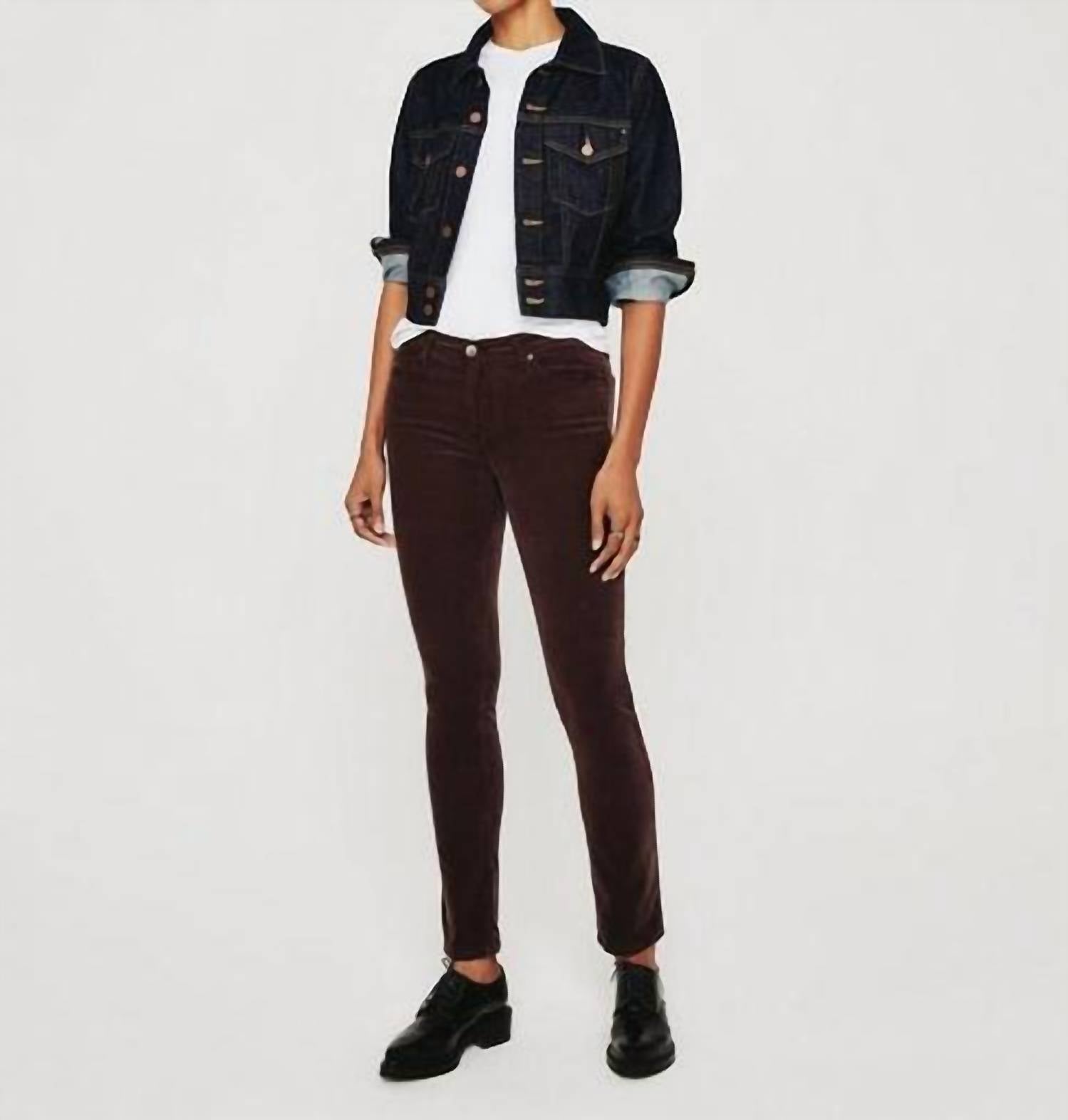Step into style with the Prima Corduroy Pants by AG Jeans, crafted for the modern woman in a rich oak hue. These mid-rise, cigarette pants are styled with a slim fit and tapered leg, featuring Envy Stretch Corduroy for comfort and flexibility. Made from 98% Cotton and 2% Lycra, these imported pants include practical pockets for added convenience. Dimensions include a front rise of 8.5", a knee opening of 13.5", a bottom opening of 11.5", and an inseam of 30". Model is wearing size 25. Perfect for back-to-school occasions in the fall season.