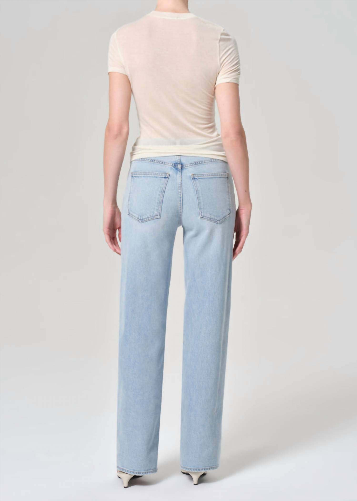 The Harper jean is crafted from regenerative cotton with just the right amount of stretch for all-day comfort. It features a relaxed mid-rise, a flattering square top block, and a straight-leg silhouette. Finished in a pale indigo wash with soft fading and whiskering, it delivers a perfectly worn-in, vintage-inspired look.
