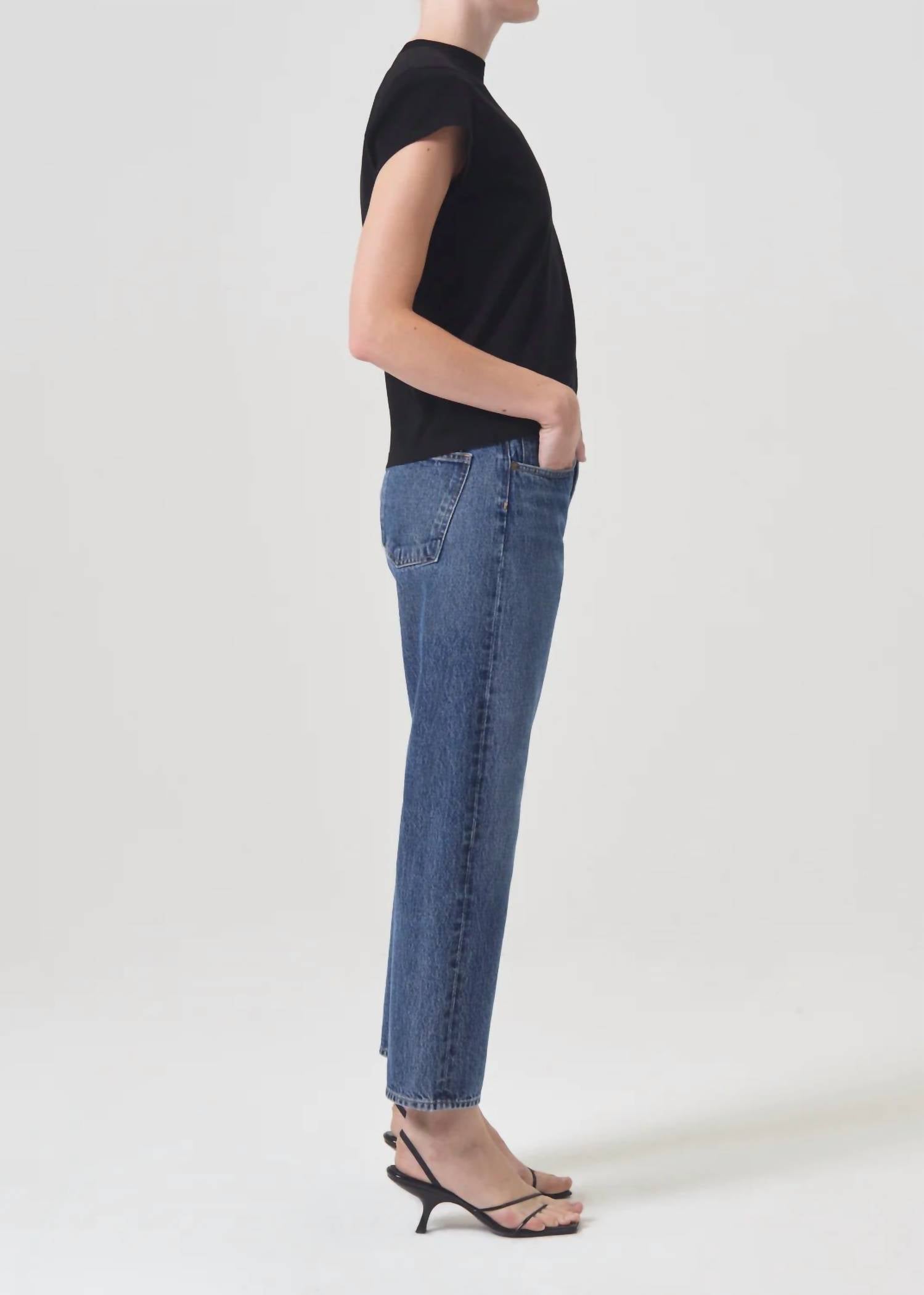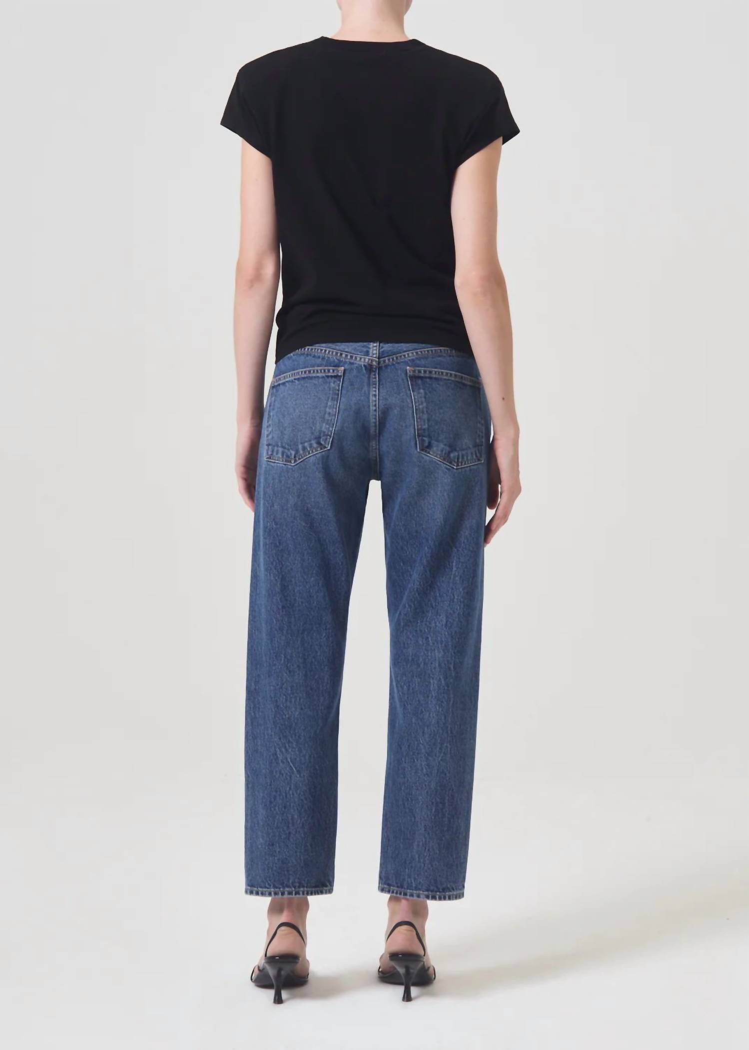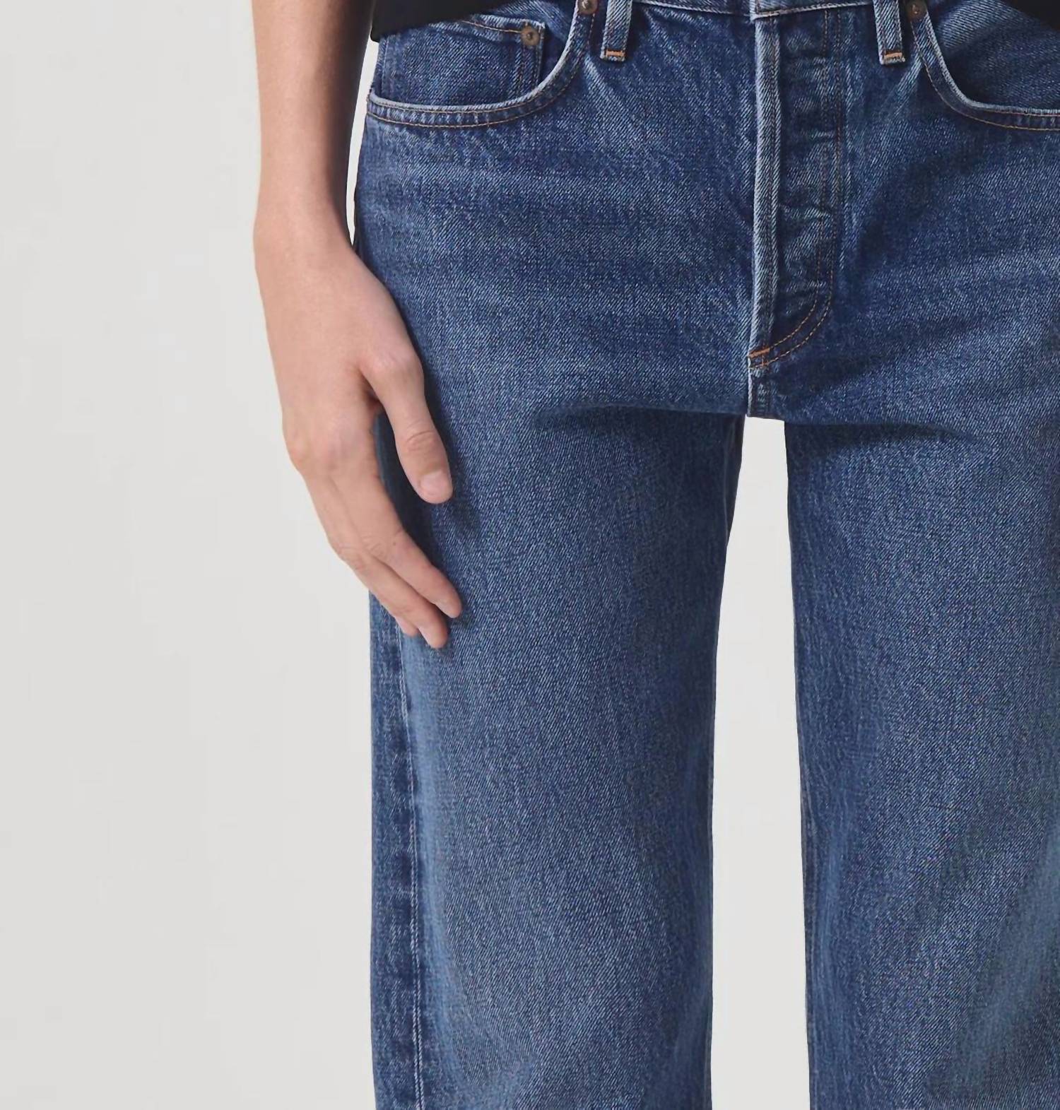 This classic straight leg jean has a perfect fit and goes with just about everything. Discover the AGOLDE Parker Jean in the intriguing Placebo hue, designed for women with a relaxed straight leg and cropped hem. These stylish jeans feature a mid-rise fit and a classic button fly closure, offering a leg opening of 14 1/2", a rise of 11 1/8", and an inseam of 26 1/2". Crafted from 100% Cotton, they provide durability and comfort suitable for various occasions, from church to workwear trends. Care is made simple with machine wash and tumble dry instructions, making these jeans a versatile addition to any fall wardrobe. Model is 5'10" wearing a size 27.